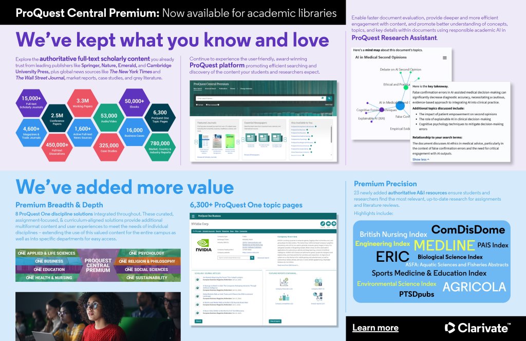 Akademické instituce z ČR (univerzity a AV ČR) mají od ledna 2026 v rámci projektu CzechELib dostupnou rozšířenou verzi databáze ProQuest Central Premium, která kromě původní plnotextové databáze ProQuest Central nabízí navíc přístup k dokumentárním a vzdělávacím filmům a dalším videomateriálům z platformy Alexander Street, a do vybraných knižních kolekcí z ProQuest Ebook Central.
